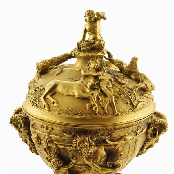 gilt bronze cup chiselled with figures and mythological animals, signed under the base, h. 25 cm.