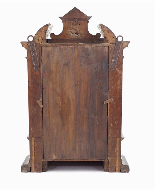 night clock, ebonised wood case with turned elements and giltwood profiles, copper dial oil painted depicting "Cristo nell'orto del Getsemani", slight wears, the clockwork is working but non coeval, 77x48x22 cm.