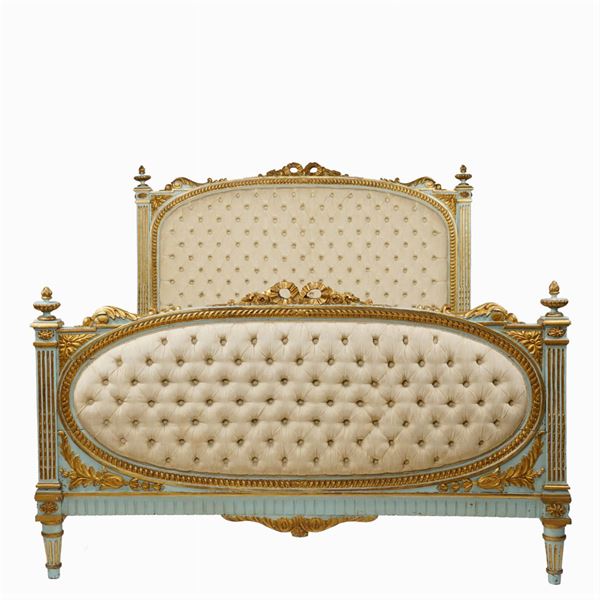 composed of a headboard and footboard inlaid with floral and vegetal patterns, padded and covered in fabric, slight defects, 138x218x164 cm.