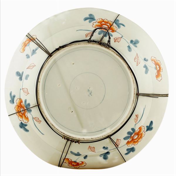 decorated in polychrome and gold on white background with two dragons and floral and vegetal patterns, blue mark under the base, d. 55,5 cm.