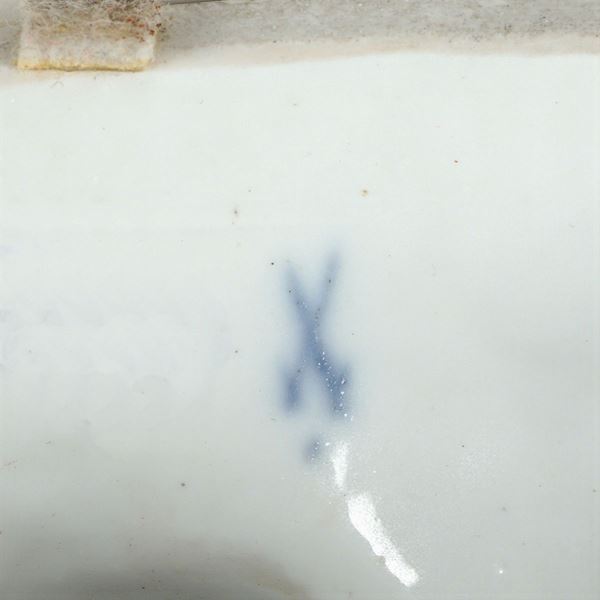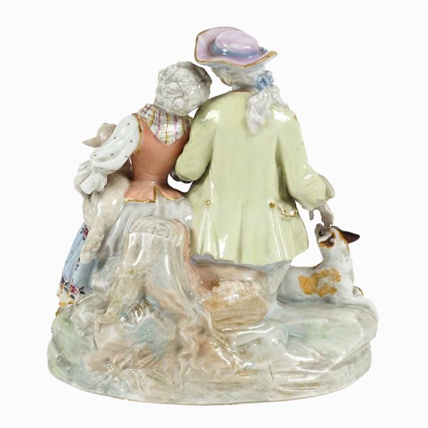 depicting a young couple, a roccailles base, mark under the base, slight defects, 21x20x13,5 cm.