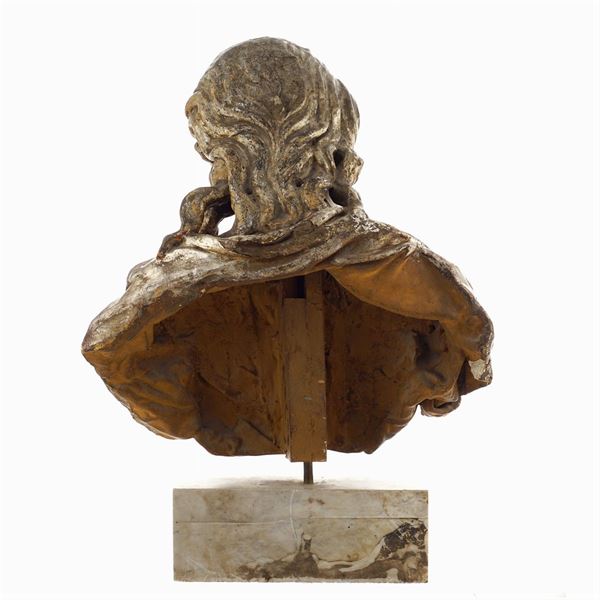"Saint reliquary bust", silver papier-mâché on a non-coeval marble base., h. 48 cm.