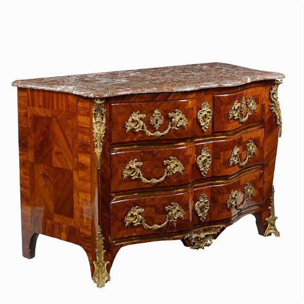 shaped line structure with gilt and chiselled bronze handles and friezes, front with four drawers, shaped red of France marble top, slight defects, 84x130x64 cm.