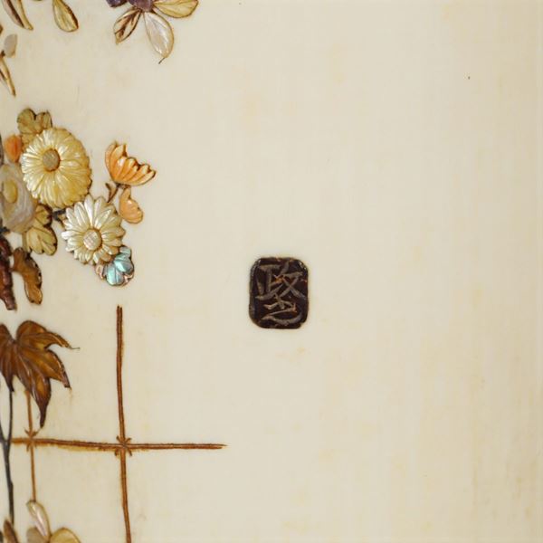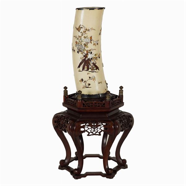 with mother of pearl, hard stones and corals inlays depicting vases of flowers and birds, exagonal inlaid teak base, signed within wood reserve, paintbrush h. 31 cm, h. totale 59 cm.