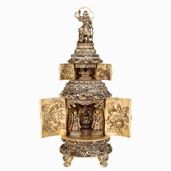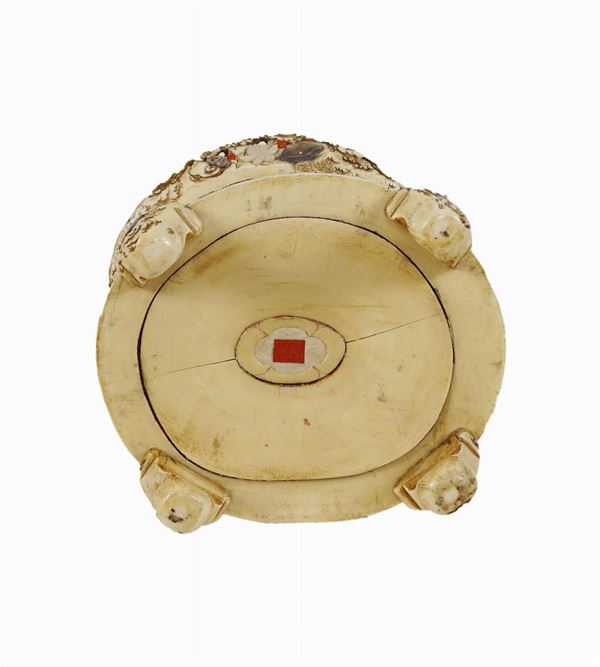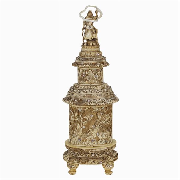cylindrical shape resting on four feet, entirely sculpteda and decorates with mother of pearls, hard stones and coral inlays, depicting scenes with sacred characters, slight defects, h. 48 cm.