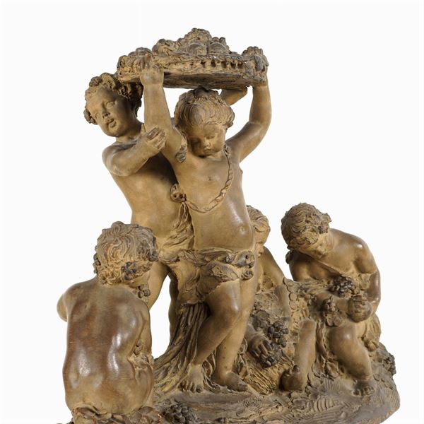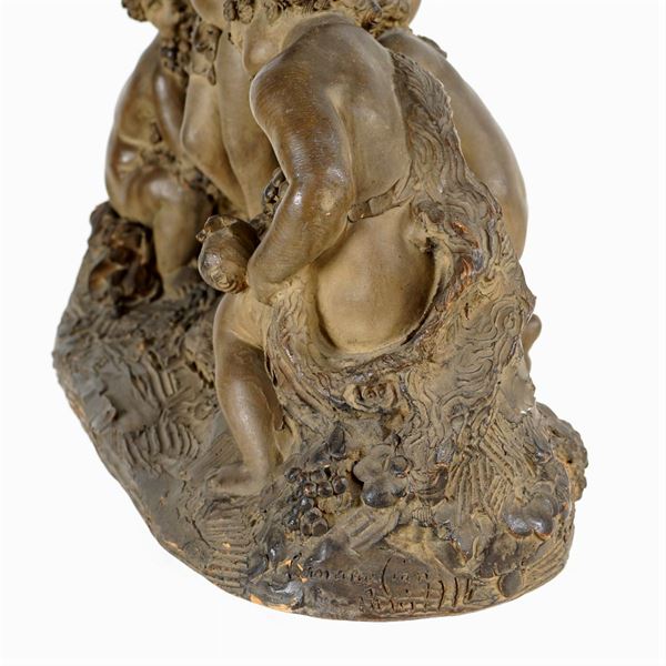 depicting a bacchanal scene with putts, signed on the right side, slight wears, 33x40x13 cm.