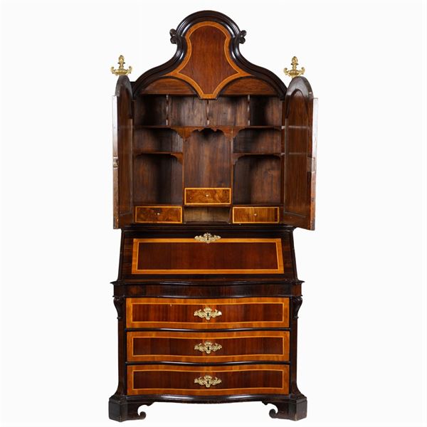 threaded in boxwood, upper part with shaped cimasa, front with two doors with coeval mirrors with drawers inside, wavy line lower part with three drawers, gilt and chiselled bronze handles, slight losses of the veneer, 248x116x70 cm.