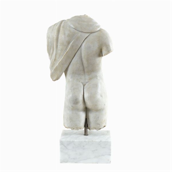 resting on a squared Carrara marble base of modern manifacture, 63x22x15 cm.