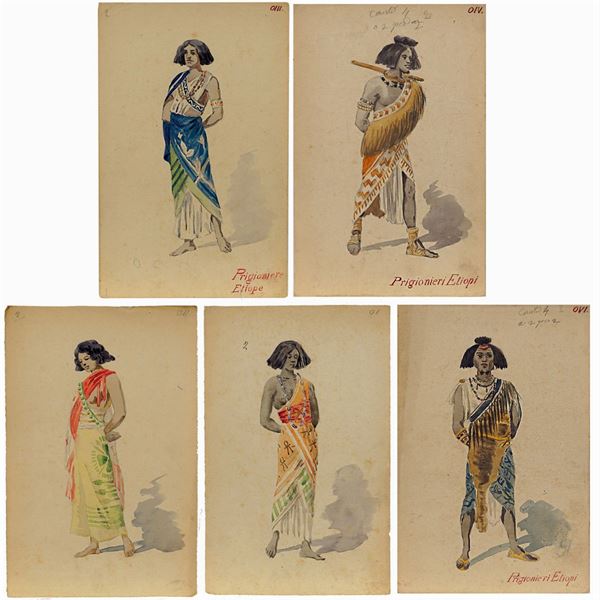 "Prigionieri e prigioniere Etiopi", 6 costume sketches for the performance of " Aida" by Giuseppe Verdi on booklet by Antonio Ghislanzoni, 6 pencils and watercolor on paper, numbered at the top left, some with title in red watercolor at the bottom right, notes in pencil on the front, defects