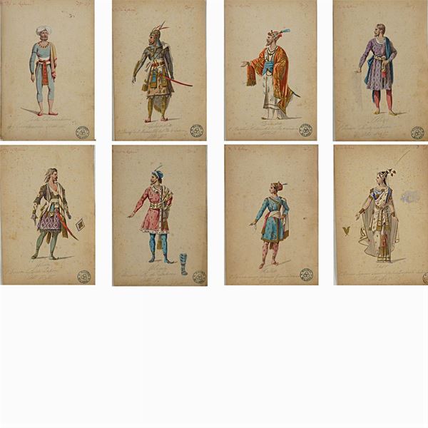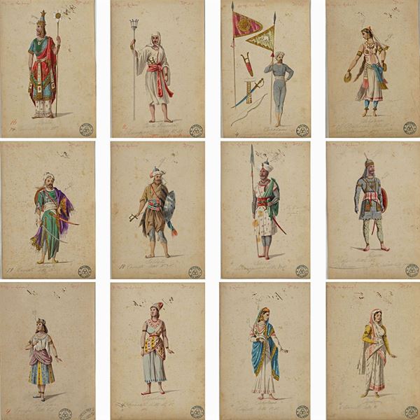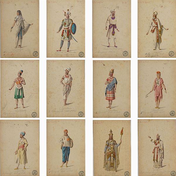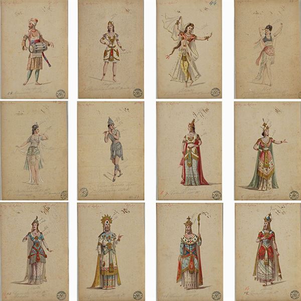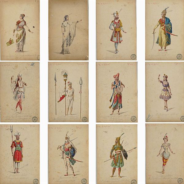 57 costume sketches for the performance of "The King of Lahore", by Jules Massenet on booklet by Louis Gallet, tempera, watercolored pencil and Indian ink on cardboard, notes on the front, stamps Ricordi Milano at the bottom right, slight defects, 32x20 cm.