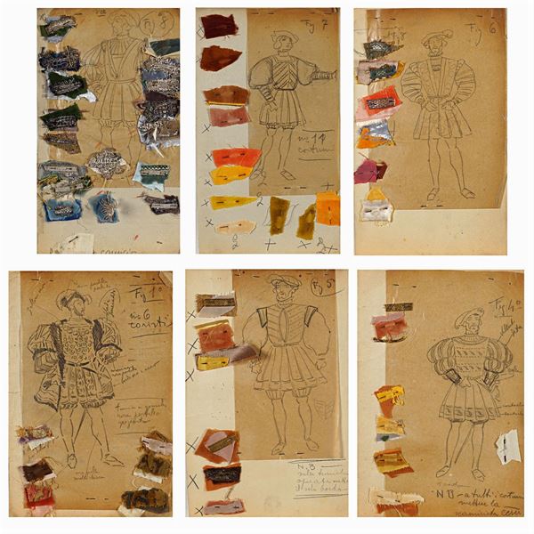 7costume sketches, pencil on tissue paper applied on cardboard, fabric remnants, velvets and ornaments applied with needle onto the paper, notes in pencil on the front for tailoring, defects, 28x22 cm.