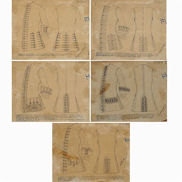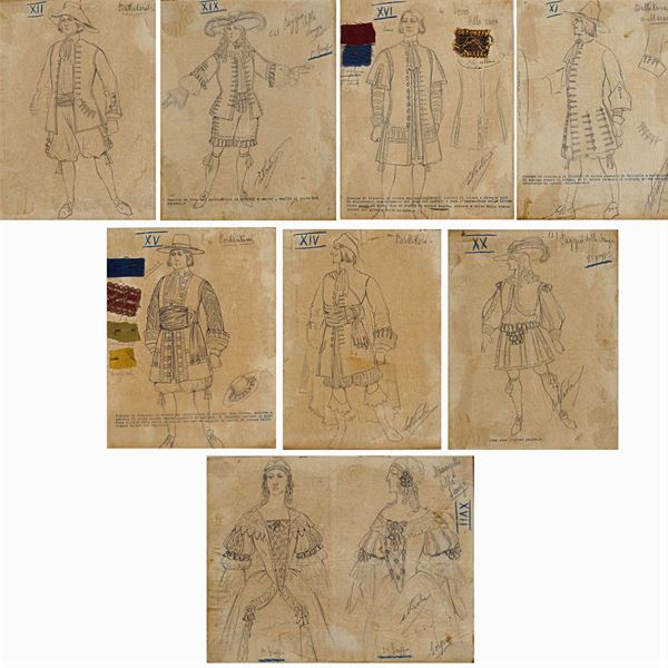 14 costume sketches, pencil on tissue paper applied on brown cardboard, some have fabric remnants applied with needles onto paper, notes at the bottom, notes written later in pencil on the front, defects, 28,5x22 cm.