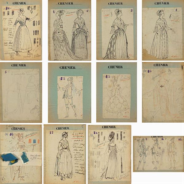13 costume sketches for the perfomance by Umberto Giordano on booklet by Luigi Illica, pencil, watercolored crayons, Indian ink and fabric remnants on paper applied on cardboard, titles at the top right, notes in pencil on the front, one sketch has Costumi d'Arte Chiappa & C letterhead pads, defects, 36x25 cm.
