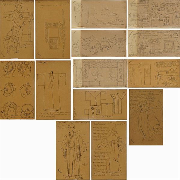 15 costume sketches for the performance by Pietro Mascagni on booklet by Luigi Illica, Indian ink on tissue paper applied on cardboard, title at the top left, notes on the front, defects, 32x19 cm.