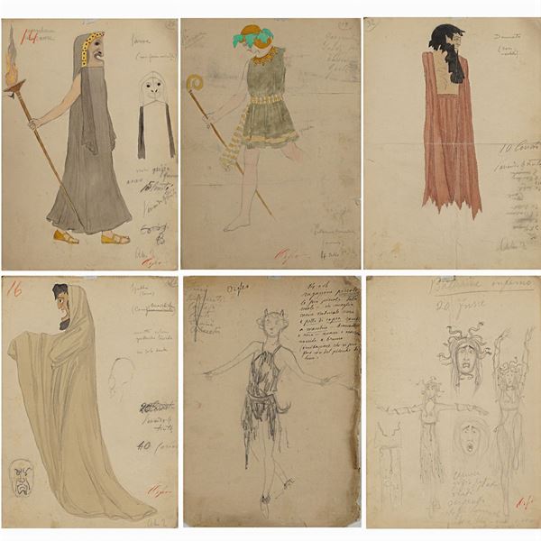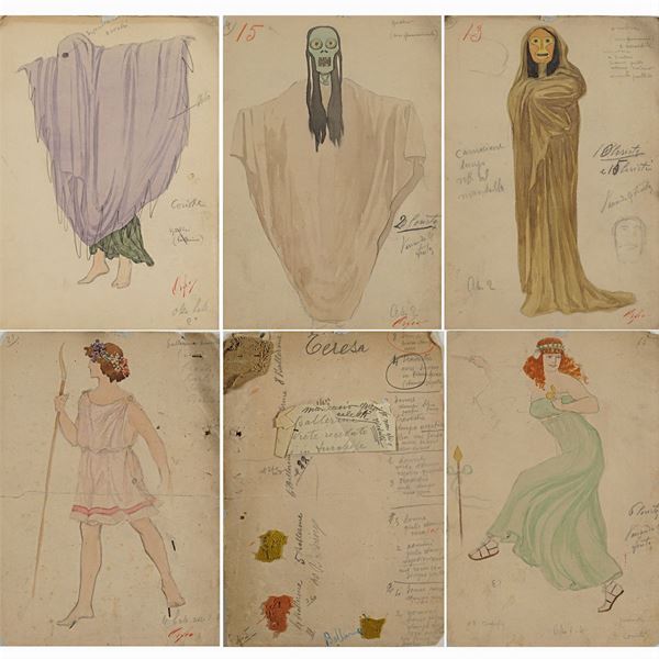9 costume sketches for the performance "L'Orfeo" by Claudio Monteverdi, pencil and watercolor on paper, notes in pencil on the front, notes and sketches on the back, one of the carboard with fabric remnants and notes for tailoring, defects, 36x25 cm.