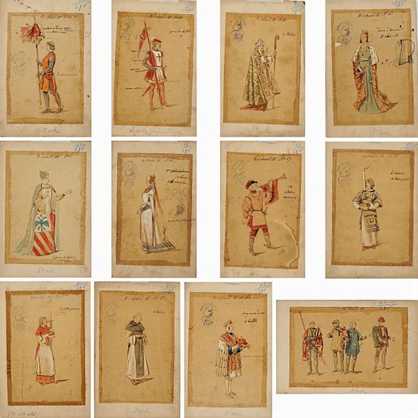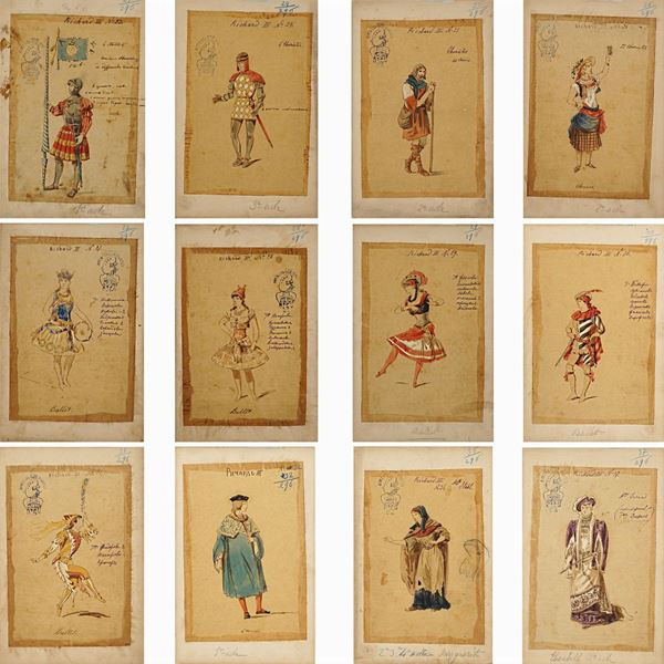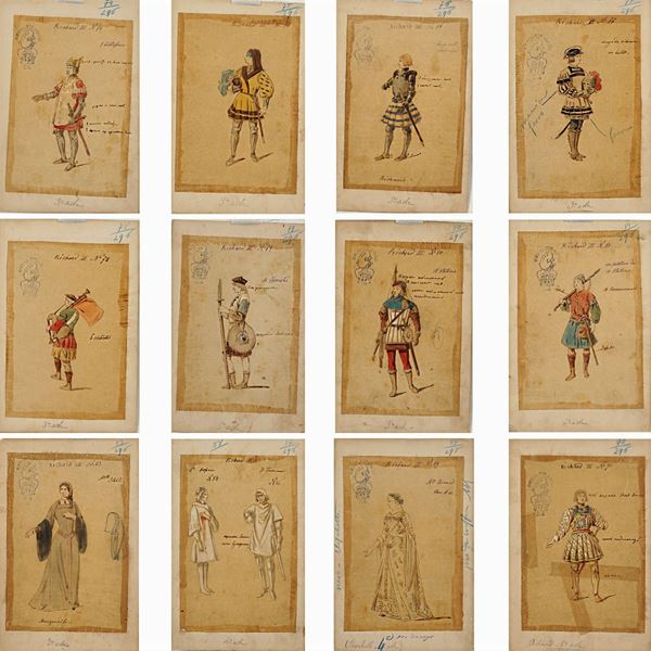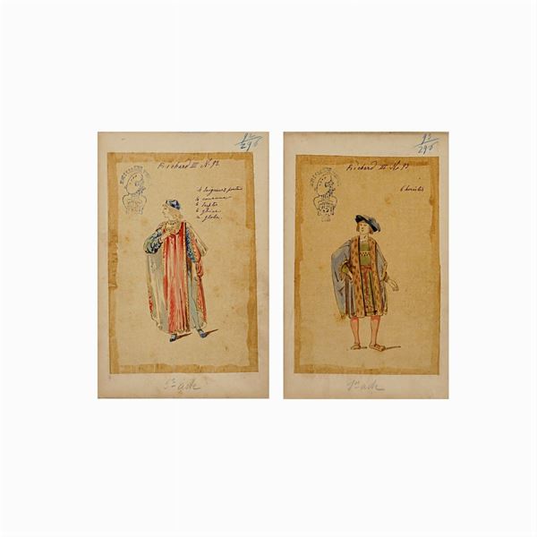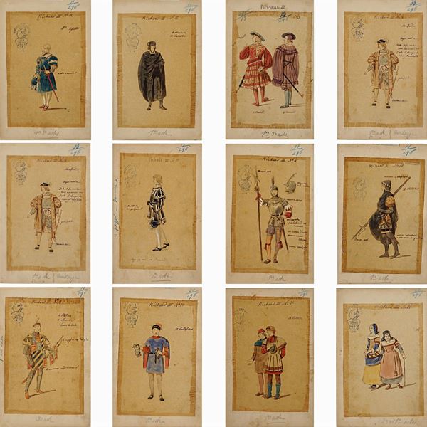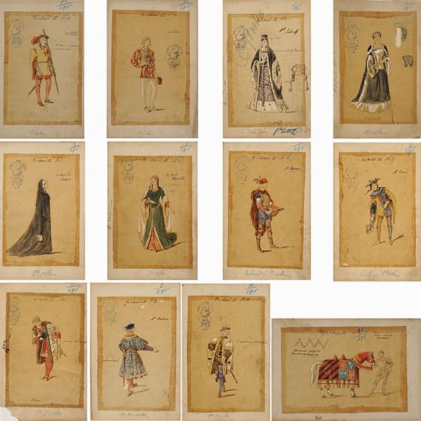 74 sketches for the performance by William Shakespeare, Indian ink, watercolor and pencil on tissue paper applied on cardboard, notes on the front, illegible stamps on the front, some cardboards have a dry stamp on the left-hand side 'Bristol L.M', some of the sketches have the inscription 'Richard III' in the Cyrillic alphabet, defects, 27x17,5 cm.