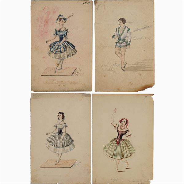 5 costume sketches, tempera, watercolored pencil and Indian ink on cardboard, three sgned at the bottom right, autograph notes on the front, defects, 24,5x17 cm.