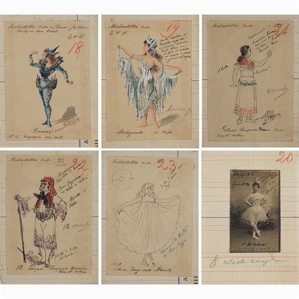 6 costume sketches and a photograph retouched for the performance "La Maladetta" by Pedro Gailhard, music by Paolo Vidal, tempera, watercolored pencil and Indian ink on paper applied on notebook sheets, five signed by G. Saracco at the bottom right, autograph notes on the front, defects, 29,5x21,5 cm.