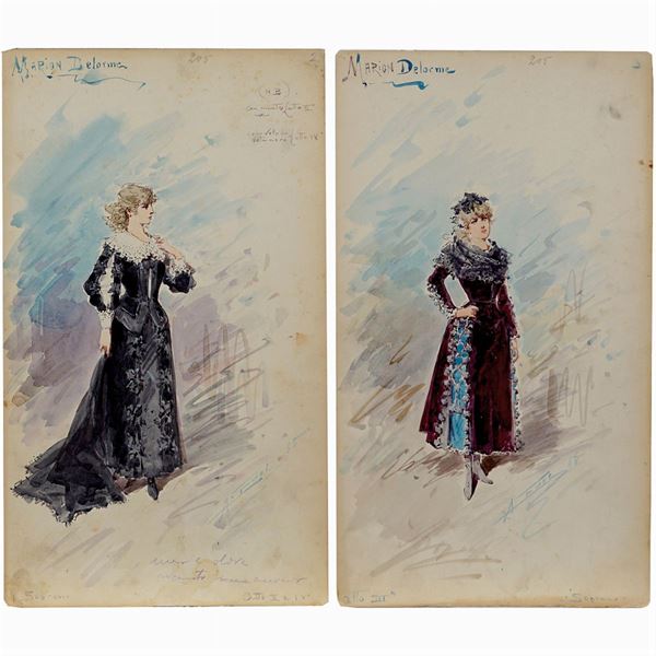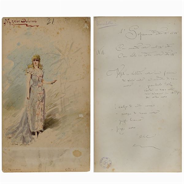 "Marion Delorme", 1885, three costume sketches for the same name performance by Amilcare Ponchielli, mixed technique on cardboard, title at the top left, notes on the front, signature and date at the bottom right, Ricordi Milano stamp on the back, slight defects, 37x21,2 cm.