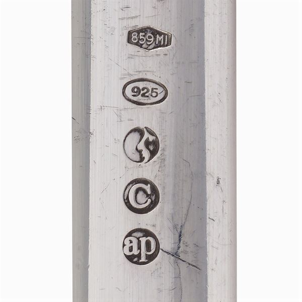 service of 123 cutlery pieces in silver 925. Consisting of: 24 forks, 12 knives, 12 spoons, 12 fruit forks, 12 fruit knives, 12 teaspoons, 12 fish forks, 12 fish knives, a ladle, a dessert scoop, a pincer, 2 cheese knives, a pair of vegetable cutlery, a pair of salad cutlery, a pair of fish cutlery, a risotto spoon, a pair of serving cutlery, a strainer, peso 7275 gr.