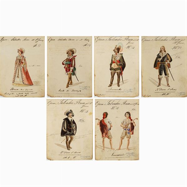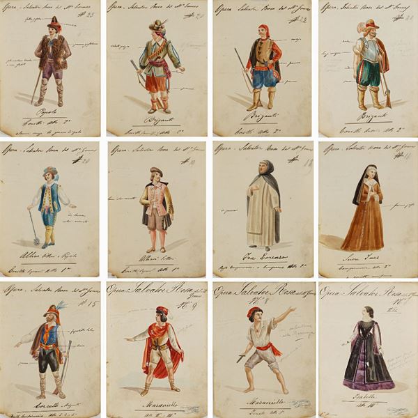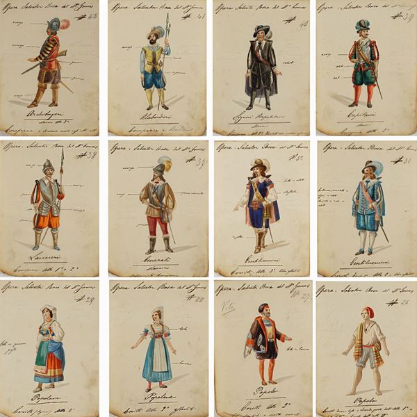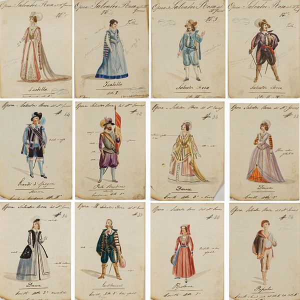 43 sketches for the performace "Salvator Rosa" by Antonio Carlos Gomes on booklet by Antonio Ghislanzoni, tempera, watercolored pencil and Indian ink on cardboard, notes on the front, notes for tailoring on the back, Sartoria Brunetti Chiappa, Milano stamps on the front, defects, 28x21,5 cm.