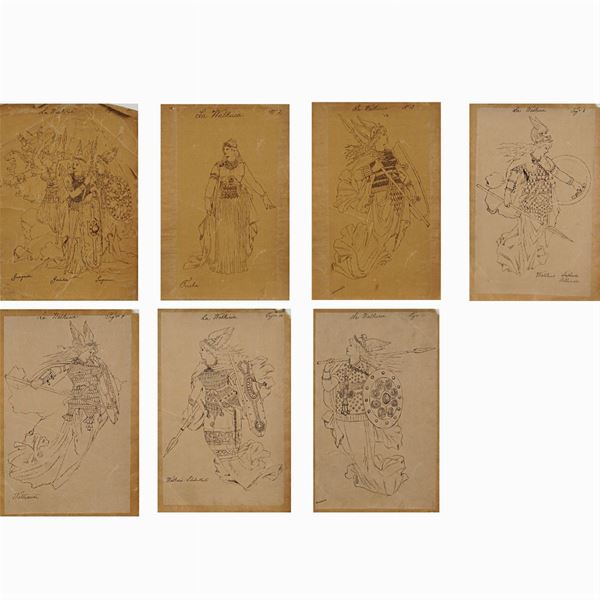 8 costume sketches for the performance by Richard Wagner, Indian ink on tissue paper applied on cardboard, numbered on the top right corner, notes for the tailoring on the back, defects, 44,5x31,5 cm.