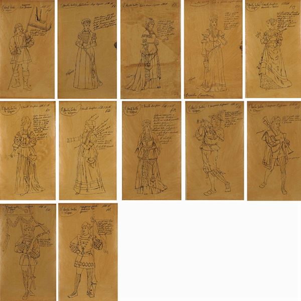 13costume sketches for the performance by Richard Wagner, Indian ink on tissue paper applied on cardboard, notes in Indian ink on the front, slight defects, 39x22 cm.