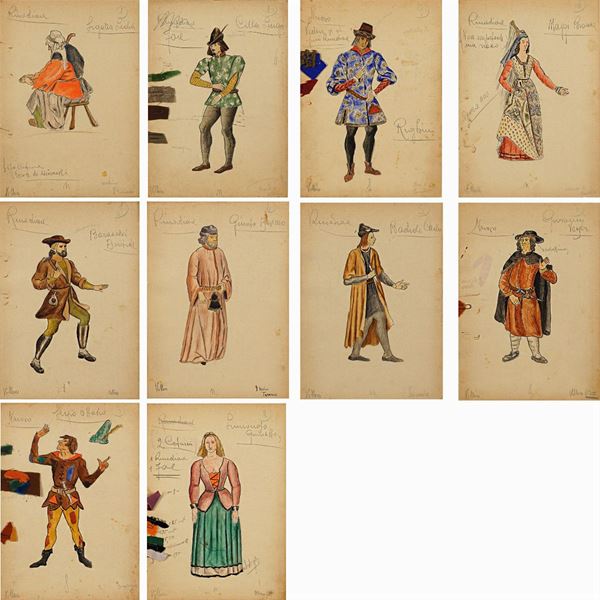 11 costume sketches for the performance by Alberto Bruni Tedeschi on a booklet by Tullio Pinelli, Indian ink, watercolor and remnants of fabric, notes in pencil on the front, defects, 35x25 cm.