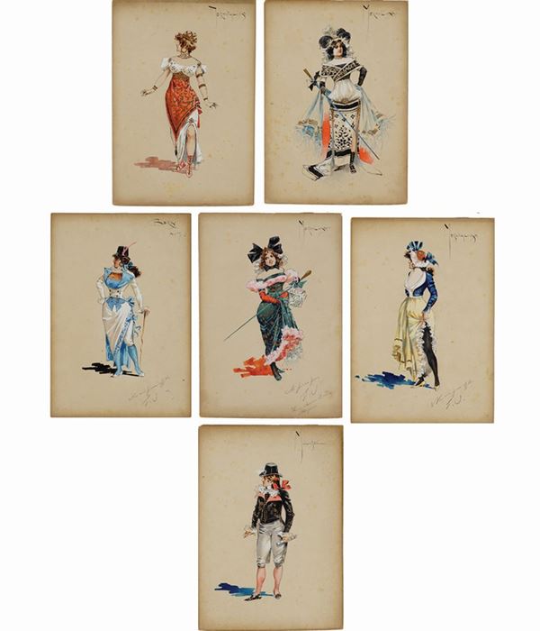 7 costume sketches probably for the performance by Umberto Giordano on a booklet by Luigi Illica, pencil, watercolor and tempera on cardboard, titles at the top right corner, some signed 'G.V' at the bottom right, notes in pencil on the front, defects, 34,5x24,2 cm.