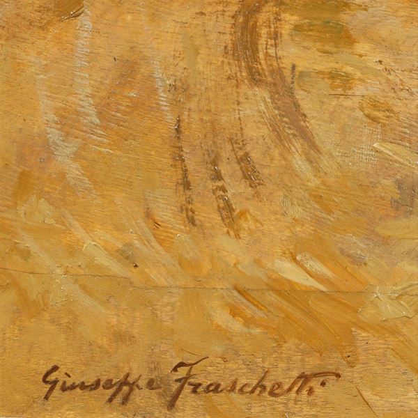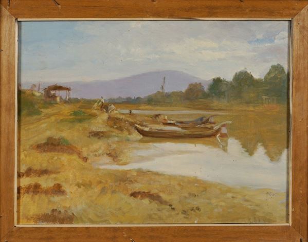"Imbarcazioni sul fiume", oil on plywood, signed at the bottom left, framed, painted on the back, 39x52,5 cm.