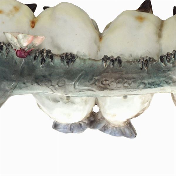 group of five enameled and glazed ceramic sparrows resting on a branch of flowers, signature under the base, stamp 'made in Italy', slight defects, 8x21x6 cm.