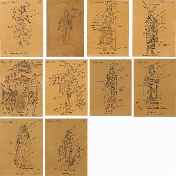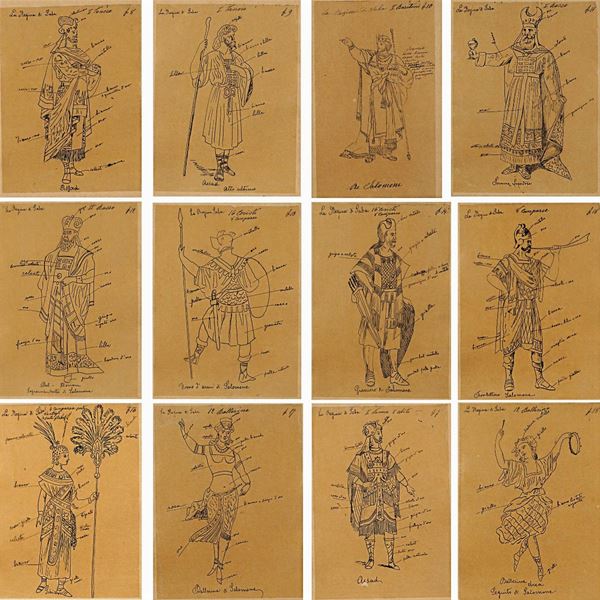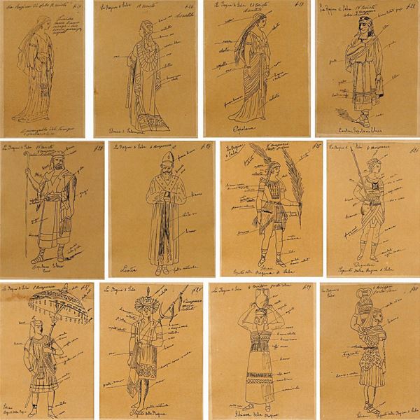 35 costume sketches for the performance "La regina di Saba" by Karl Goldmark on a booklet by Salomon Hermann von Mosenthal, Indian ink on tissue paper applied on brown cardboard, notes on the front, defects, 31,5x22,5 cm.