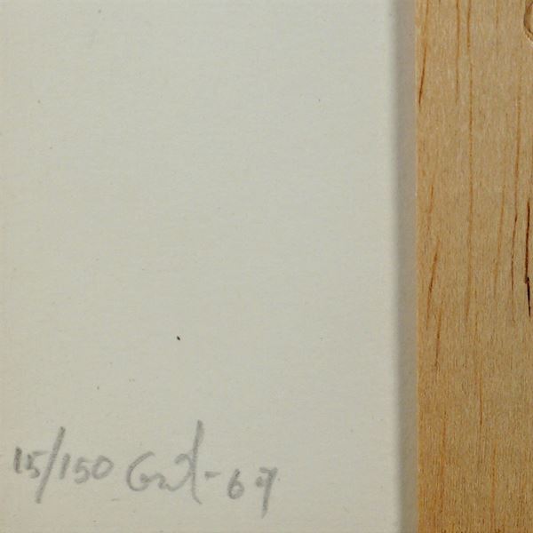 "Profiles", 1969, ex. 15/150, wood applied on paper, signature and date at the bottom left, framed, 37,5x40,5 cm.