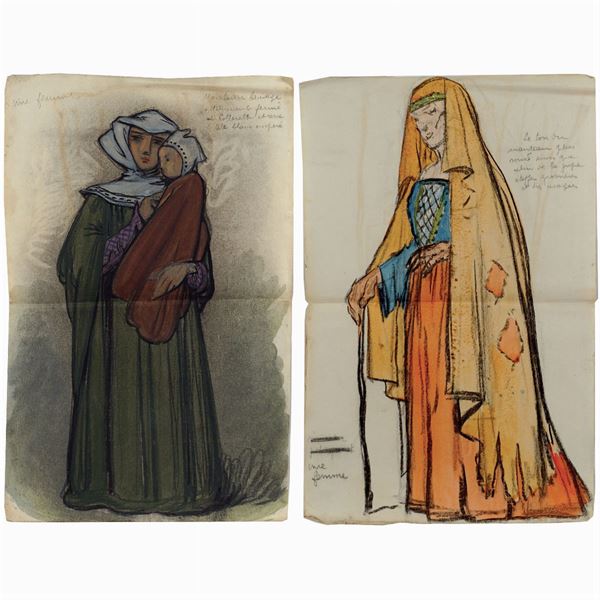 3 costume sketches for the performance "Une Femme", tempera and cardboard on paper, notes in pencil for the tailoring on the front, note and initial on the back, defects, 47,5x31 cm.