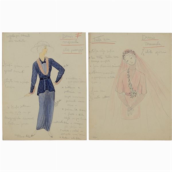 3 theatre costume sketches, pencil, watercolor and Indian ink on cardboard, autograph notes in pencil on the front, one is signed at the bottom left, defects, 29x23 cm.