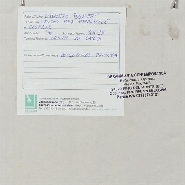 "Studio per pubblicitĂ - Cinzano", mixed technique on paper, '30s circa, signed on the left side, framed. Authenticity certificate released by Adriana and Mario Bonetti with n. 446. Provenance: Private collection, Rome, 21x29 cm.
