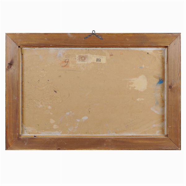 "At the port", oil on canvas cardboard, signed at the bottom left, on the back contains a cartouche of the VIIth Universal Art Exhibition of the City of Venice of 1907, where this work was exhibited with No. 861, within a golden and ebonized wooden frame, 42x67 cm.