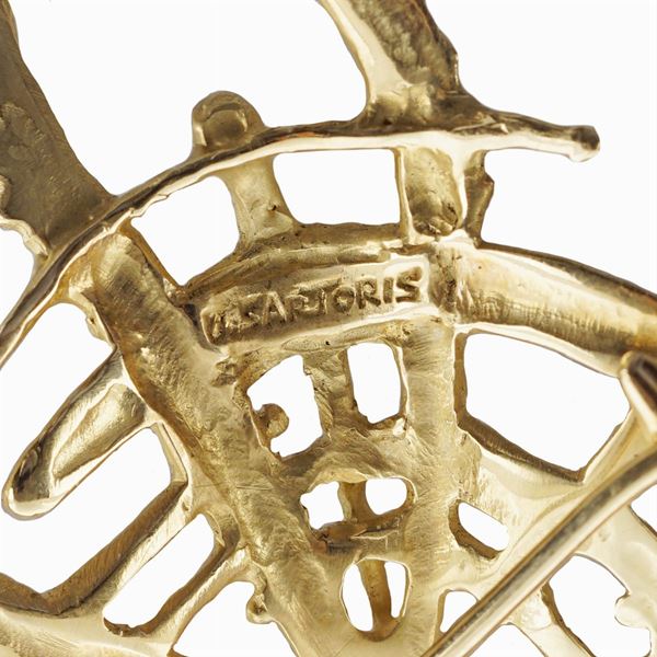 18kt gold depicting a spider with a web centered by a cabochon ruby, signed inside, peso 42,1 gr.