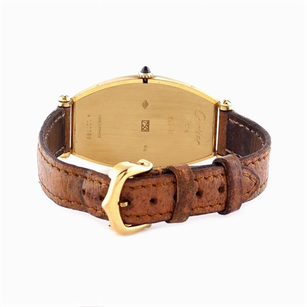 18kt ywllow gold, 39x26 mm. tonneau case - ref. n. 52291 - A107799, guillochè dial with roman numbers, crown with cabochon sapphire, mechanical movement with manual winding, leather strap with golden metal buckle