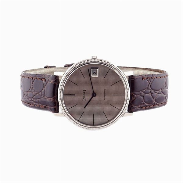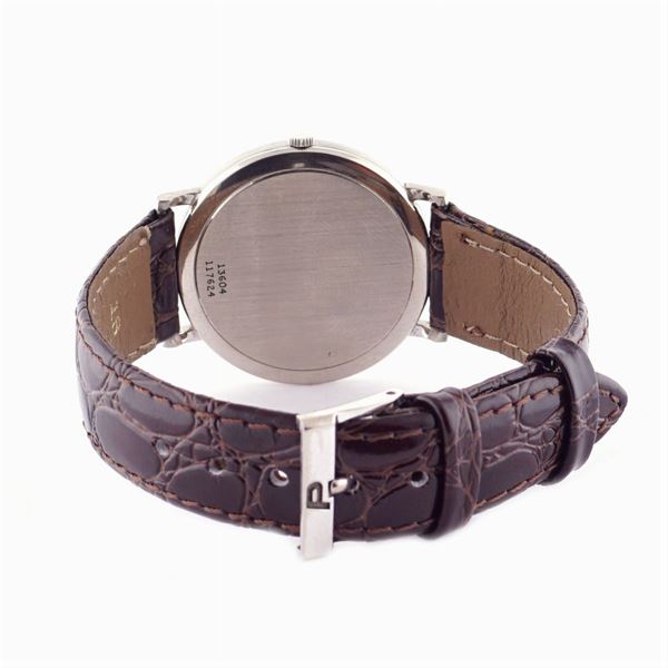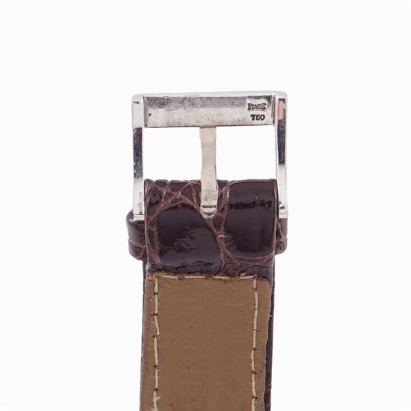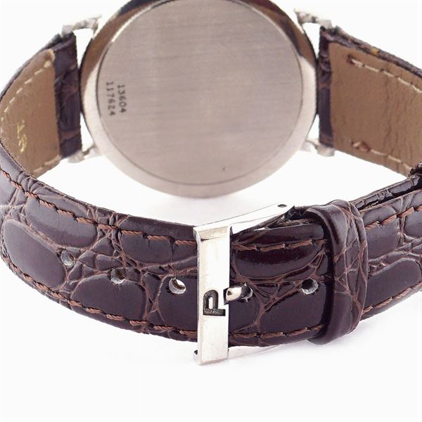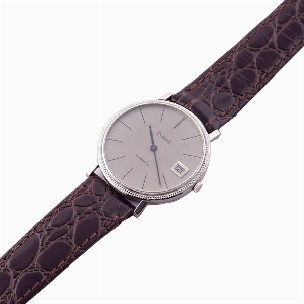 18kt white gold, 32 mm. round case, ref. 13604 - 117624, "clou de Paris" bezel, silvered guilloché dial, dated at 3 o'clock, sapphire crystal, mechanical movement with automatic winding, leather strap with original 18kt white gold buckle