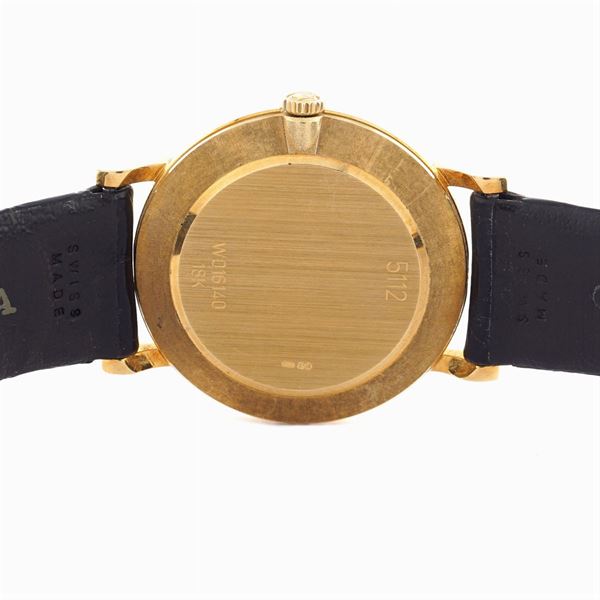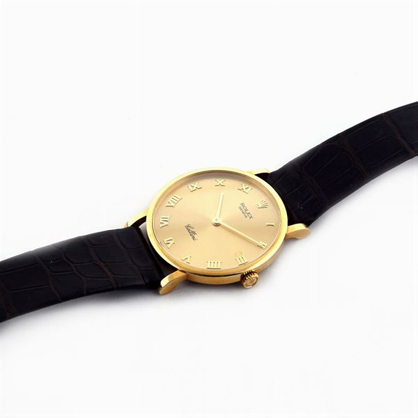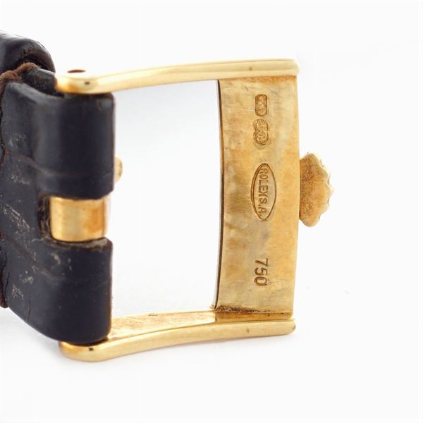18kt gold, 32 mm. round case, ref. 5112, golden dial with Roman numerals, sapphire glass, mechanical movement with manual winding, rolex caliber 1602, original leather strap and 18kt gold buckle