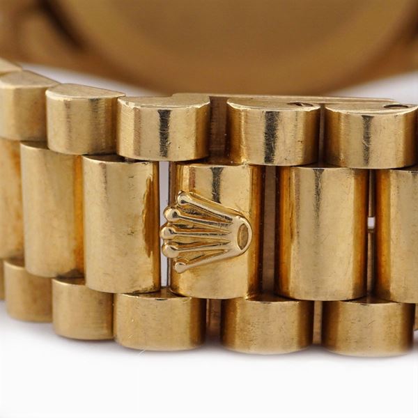 18kt yellow gold, 31mm round case, knurled bezel, ref. 6827, golden dial with brilliant cut diamonds indexes, date 3 o'clock, mechanical movement with automatic winding ref. 59842, caliber 2030, original 18kt gold president bracelet with hidden clasp, peso 47,3 gr.