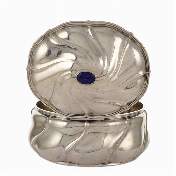 oval body with torchon patterns, lid centered by a lapis lazuli cabochon cut, 13x22x18 cm., peso 1062 gr.