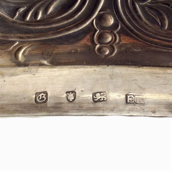 Emick Romer goldsmith, pierced body chiselled with rich vegetal, floral, vine shoots and wheat spikes patterns, centered by an inlaid heraldic crest, 27x36x33 cm., peso 865 gr.