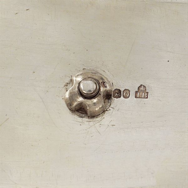 Rundell, Bridge & Rundell (John Bridge) goldsmith, rectangular body section with shaped profile, surface decortated with naturalistic patterns and a heraldic crest, non coeval base container, 18,5x26x22,5 cm., peso 1.886 gr.