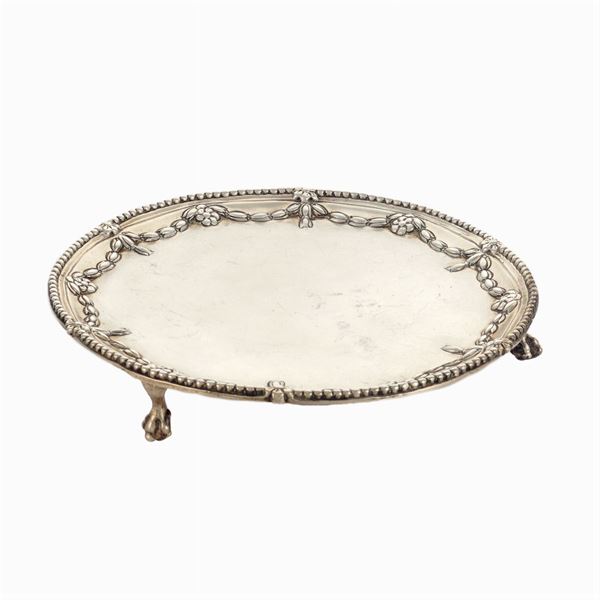 Robert Jones I goldsmith, circular body profiled with floral and vegetal garlands, resting on three ferini feet, 3x17,5 cm., peso 280 gr.