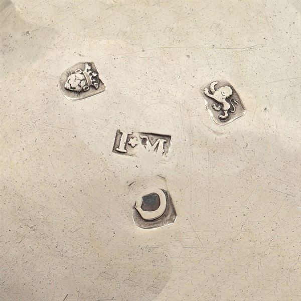 Jacob Marsh o John Moore goldsmith, plain body with gadrooned profiles, scroll shaped handle with vegetal pattern lid grip, h. 22 cm., peso 906 gr.