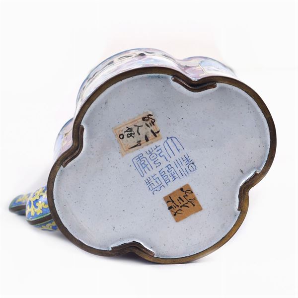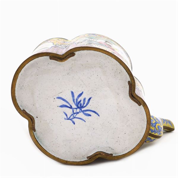 four- leaf clover shaped, decorated in polychromy with floral patterns and figures, one is marked Qianlog  under the base, 18x13x9 cm.