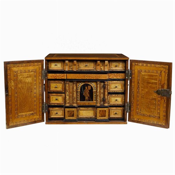 body inlaid with vegetal and geometrical motives, front with two doors with various drawers inside, burnished bronze handles, slight defects, 39x48x30