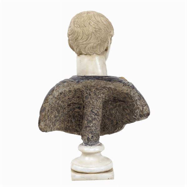 depicting a roman emperor, grey marble cloak, resting on a circular base, h. 30 cm.